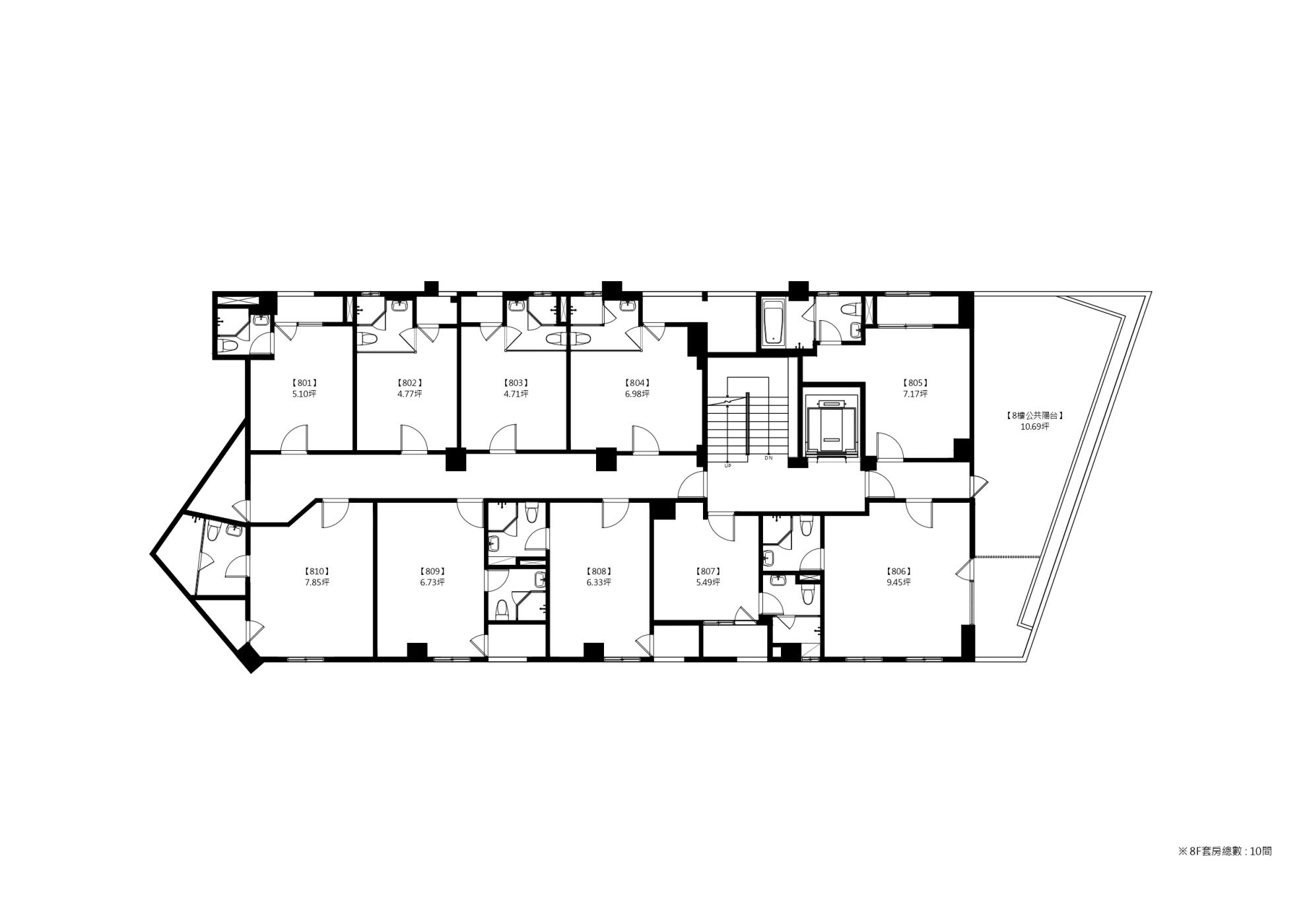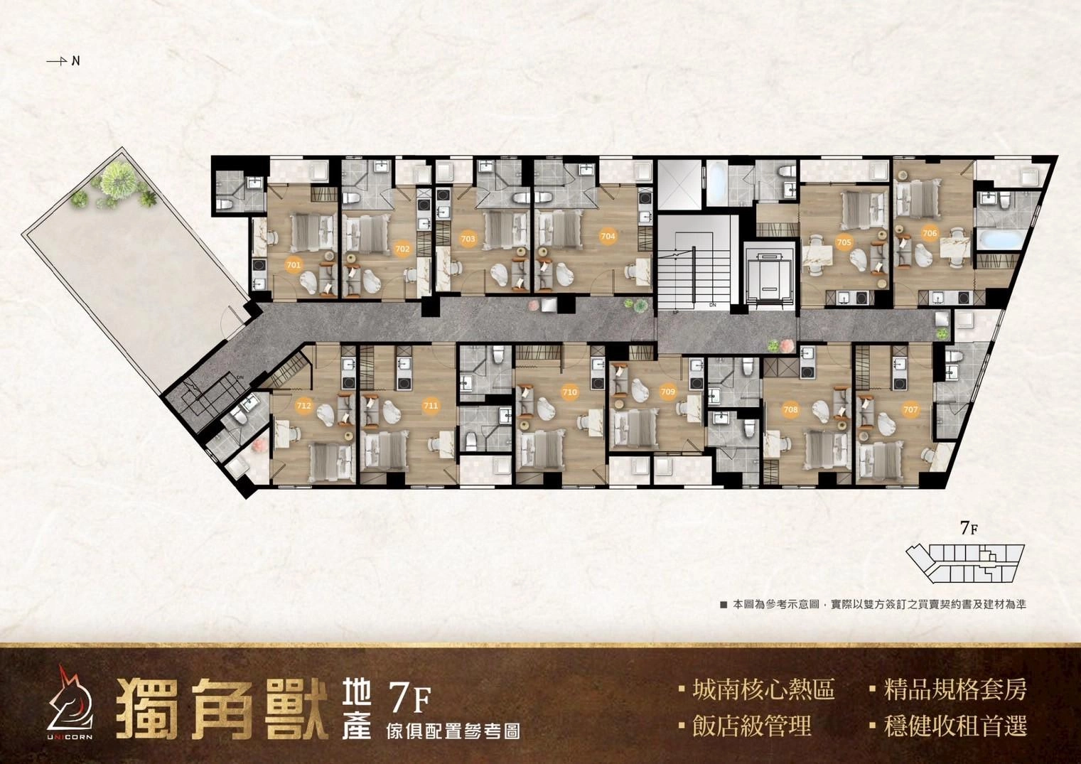 整棟7樓層,共11戶86間獨立套房+1店面,套房從3戶到22戶皆有配置,依樓層獨立分售。